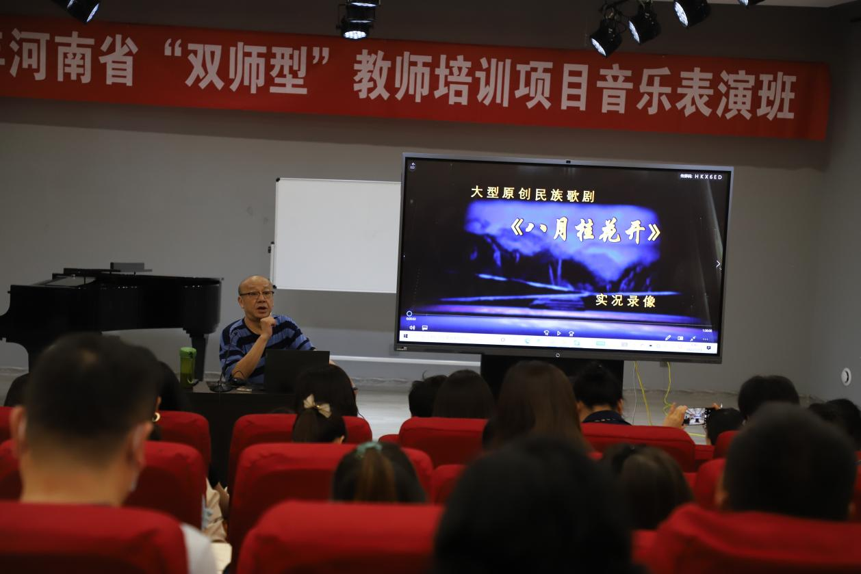 7月13日上午,刘宏奎为音乐表演专业“双师型”学员讲授信阳地方歌剧《八月桂花开》创作手法及历程。