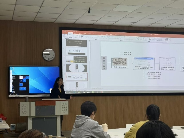 在热烈的掌声中,冯亚教授围绕教育部发布的《义务教育课程方案和课程标准(2022年版)》展开了精彩讲座。冯亚教授首先简要分析了不同版本教材的特点,随后重点讲解了“新三科”的教学方法。她从大纲入手,逐层剖析教材设计的底层逻辑,并详细讲授了八年级上册和下册中影视、戏剧、舞蹈等内容的教学方法,举出详实的案例让大家理解新编教材中的知识与技能逻辑,人文主题逻辑,本次讲座为参训教师带来了前沿的理论与实践知识,进一步提升了中小学教师的专业素养,对于推动教育改革具有重要意义。