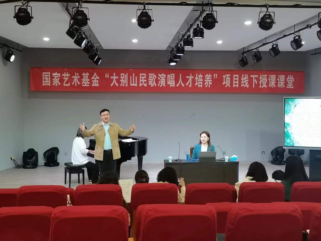 3月14日上午,国家艺术基金“大别山民歌演唱人才培养”线下授课课堂在公司太阳成集团tyc539一楼八音讲堂如期进行。大别山民歌传承人,信阳市民歌研究会副主席李鸣凤应公司邀请,以《豫南田歌》为题进行线下教学。