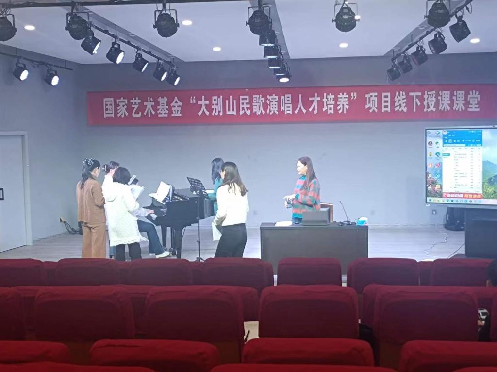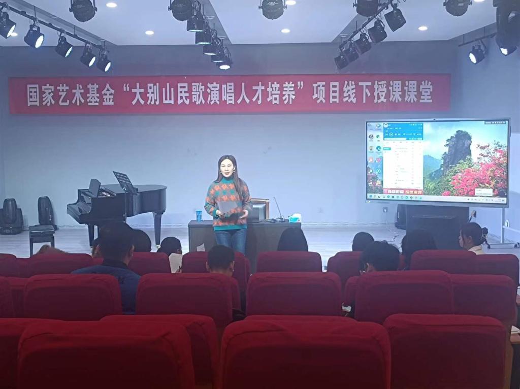 3月15日上午,国家艺术基金“大别山民歌演唱人才培养”线下授课课堂在公司太阳成集团tyc539一楼八音讲堂火热进行中。信阳民歌歌唱家,大别山民歌传承人,信阳市民歌研究会副主席李鸣凤应公司邀,以《豫南小调(一)》为题进行线下教学。