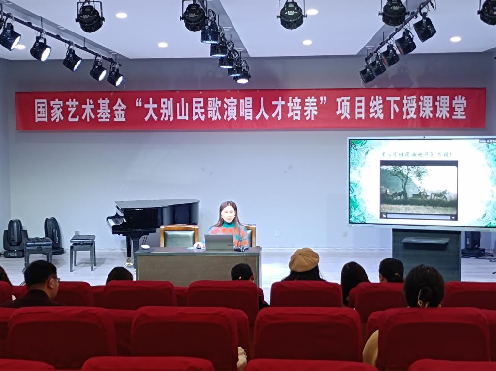 3月17日上午,国家艺术基金“大别山民歌演唱人才培养”线下授课课堂在公司太阳成集团tyc539一楼八音讲堂如期进行。大别山民歌传承人,信阳市民歌研究会副主席、国家三级演员李鸣凤老师应公司邀请,以《豫南灯歌(一)》”为题进行线下教学。