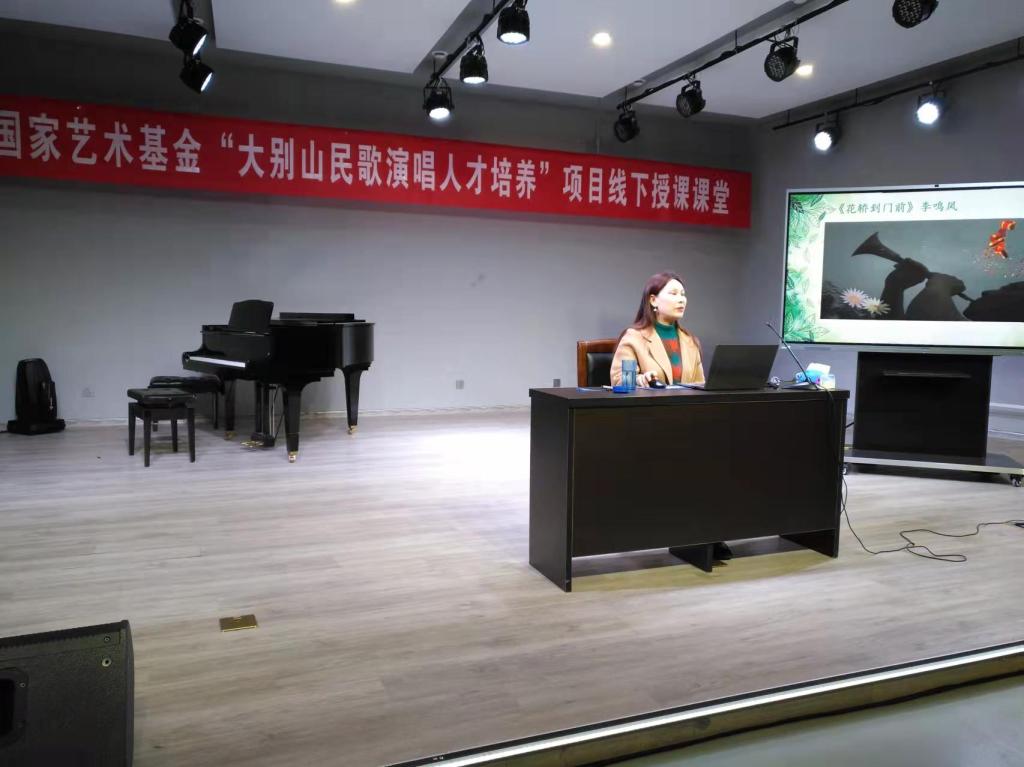 3月18日上午,国家艺术基金“大别山民歌演唱人才培养”线下授课课堂在公司太阳成集团tyc539一楼八音讲堂如期进行。大别山民歌传承人,信阳市民歌研究会副主席李鸣凤应公司邀请,以《豫南叙事歌》为题进行线下教学。