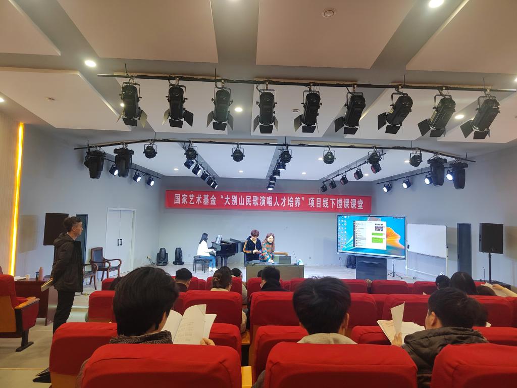 3月18日下午,国家艺术基金“大别山民歌演唱人才培养”线下授课课堂在公司太阳成集团tyc539一楼八音讲堂如期进行。大别山民歌传承人,信阳市民歌研究会副主席李鸣凤老师应公司邀请,为学员授课,参与实践课的还有韩冰副教授和张梦晗老师。