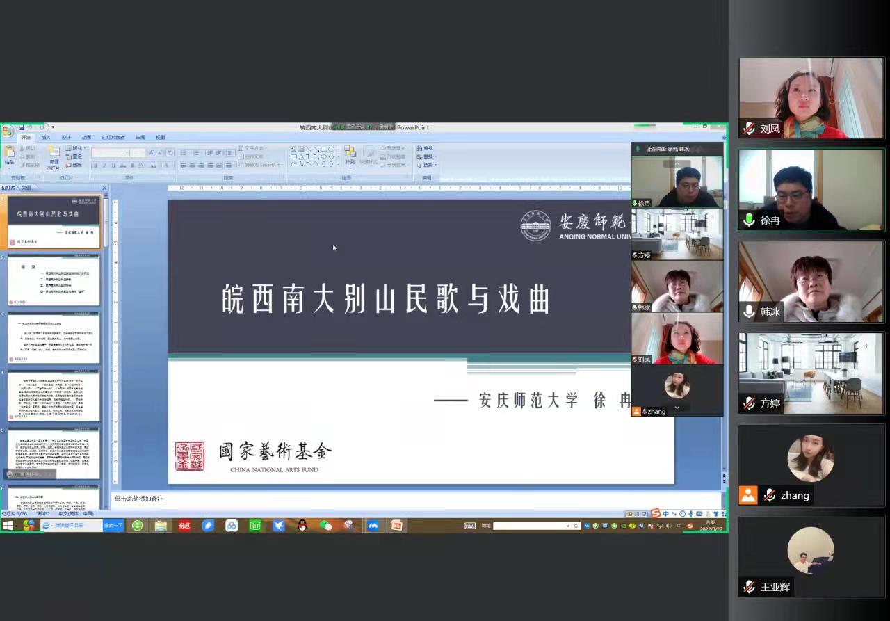 3月27日上午,国家艺术基金“大别山民歌人才培养”项目线线上授课继续开展。由安庆师范大学副教授硕士生导师、音乐公司副经理徐冉以《皖西南大别山民歌与戏曲》为题进行讲解。会议由韩冰老师主持。
