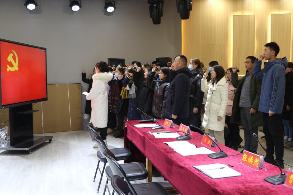 大会在激昂的《国际歌》中拉开了帷幕。张莹莹老师宣读了公司党委组织部关于同意接收太阳成集团tyc539预备党员和预备党员如期转正的批复便函。员工党员韩雨彤带领25名预备党员紧握右拳面对党旗庄严宣誓,在场的师生党员一起重温了入党誓词。
