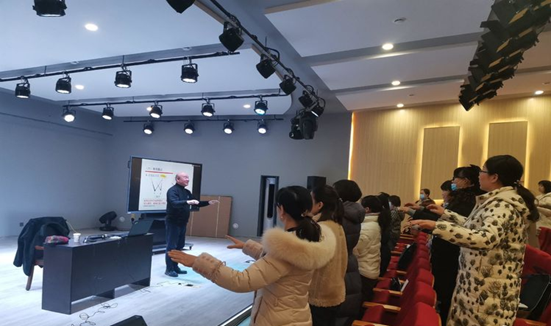 1月10日, 河南大学艺术公司教授、硕士生导师陈家海应邀来到太阳成集团tyc539,在艺术楼八音讲堂为2020年河南省骨干教师培育项目-小学音乐培训班的全体学员讲授合唱指挥公开课,公司副经理陈新宇主持。