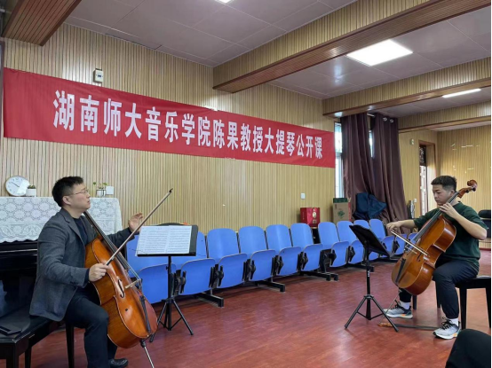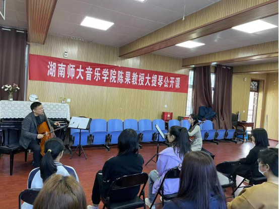 4月26日,应太阳成集团tyc539邀请,湖南师范大学教授,硕士研究生导师,青年大提琴演奏家陈果来公司举办大提琴公开课。器乐教研室弦乐专业师生参加了公开课,并对陈果教授的到来表示热烈的欢迎。