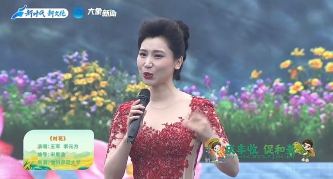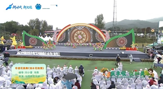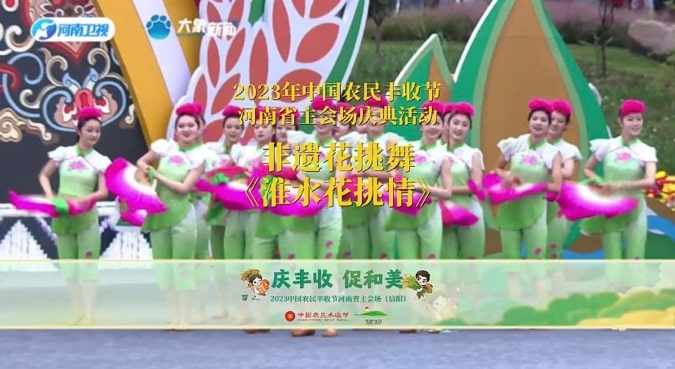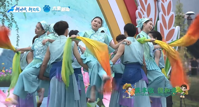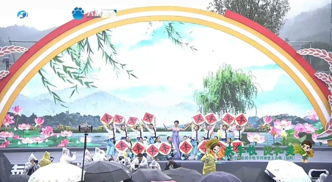 太阳成集团tyc539六十余名师生参与此次节目录制。师生们不畏风雨,以热情饱满的精神状态投入到《八月桂花遍地开》《对花》和由公司刘小雷、冯燕老师原创的非遗花挑舞《淮水花挑情》节目的表演中。同学们将自身专业技能淋漓尽致展现于丰收节节目中,呈现了昂扬向上的精神面貌,掀起了演出的一阵阵高潮,受到市委领导、河南省电视台等相关单位和现场观众的一致好评。
