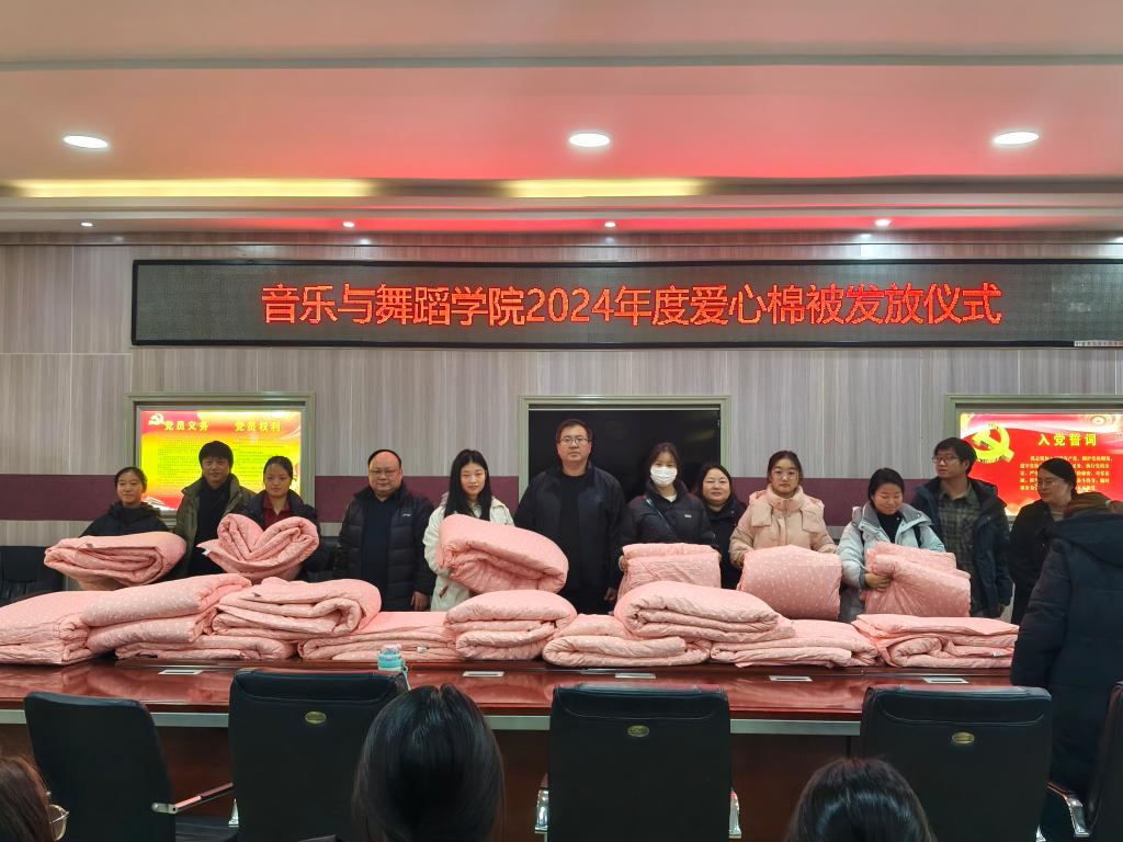 12月17日下午,太阳成集团tyc539“寒冬送温暖”爱心棉被发放仪式在艺术楼三楼会议室举行。公司党委书记周文勇、副经理任远、党委副书记雷玲,经理助理、舞蹈教研室主任刘小雷以及全体辅导员和30名员工代表参加发放仪式。